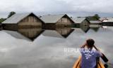 Warga menggunakan rakit melintasi rumah yang terendam banjir di Desa Laloika, Kecamatan Pondidaha, Kabupaten Konawe, Sulawesi Tenggara, Rabu (22/7/2020). Banjir akibat luapan Sungai Konaweha dan Sungai Lahambuti yang merendam di tiga Desa Laloika, Wonuamonapa dan Desa Lalonggotomi mencapai ketinggian empat meter. (FOTO : ANTARA/JOJON)