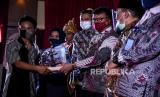 Direktur Jenderal Pemasyarakatan (Dirjen PAS) Kementerian Hukum dan HAM (Kemenkum Ham) Reinhard Silitonga menerima cinderamata dari anak didik lapas (Andikpas) pada kegiatan Pemberian Remisi Anak dalam Rangka Hari Anak Nasional di Lembaga Pembinaan Khusus Anak (LPKA) Kelas II Bandung, Jalan Pacuan Kuda, Kota Bandung, Kamis (23/7). Sebanyak 857 anak didik lapas (Andikpas) yang berada di LPKA, Lapas dan Rutan Se-Indonesia mendapatkan remisi dalam rangka Hari Anak Nasional 2020. Foto: Abdan Syakura/Republika (FOTO : ABDAN SYAKURA/REPUBLIKA)