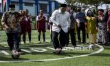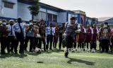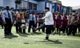 Direktur Jenderal Pemasyarakatan (Dirjen PAS) Kementerian Hukum dan HAM (Kemenkum Ham) Reinhard Silitonga menendang bola pada kegiatan Pemberian Remisi Anak dalam Rangka Hari Anak Nasional di Lembaga Pembinaan Khusus Anak (LPKA) Kelas II Bandung, Jalan Pacuan Kuda, Kota Bandung, Kamis (23/7). Sebanyak 857 anak didik lapas (Andikpas) yang berada di LPKA, Lapas dan Rutan Se-Indonesia mendapatkan remisi dalam rangka Hari Anak Nasional 2020. Foto: Abdan Syakura/Republika (FOTO : ABDAN SYAKURA/REPUBLIKA)