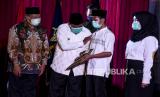 Wakil Gubernur Jawa Barat Uu Ruzhanul Ulum (kedua kiri) bersama Wali Kota Bandung Oded M Danial (kiri) memberikan surat remisi kepada perwakilan anak didik lapas (Andikpas) saat kegiatan Pemberian Remisi Anak dalam Rangka Hari Anak Nasional di Lembaga Pembinaan Khusus Anak (LPKA) Kelas II Bandung, Jalan Pacuan Kuda, Kota Bandung, Kamis (23/7). Sebanyak 857 anak didik lapas (Andikpas) yang berada di LPKA, Lapas dan Rutan Se-Indonesia mendapatkan remisi dalam rangka Hari Anak Nasional 2020. Foto: Abdan Syakura/Republika (FOTO : ABDAN SYAKURA/REPUBLIKA)