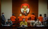 Ketua KPK Firli Bahuri (tengah), Juru bicara KPK Ali Fikri (kanan) menyampaikan konferensi pers penahanan terhadap lima tersangka dugaan tindak pidana korupsi proyek fiktif di BUMN PT Waskita Karya Tbk tahun 2009-2015 di Gedung KPK, Jakarta, Kamis (23/7). KPK resmi menahan lima tersangka yaitu Kepala Divis II PT. Waskita Karya Tbk periode 2011-2013 Fathor Rachman, Kepala Bagian Keuangan dan Risiko Divisi II PT. Waskita Karya Tbk periode 2010-2014 Yuly Ariandi Siregar, mantan Kepala Divisi III/Sipil/II PT. Waskita Karya Tbk Desi Arryani, mantan Kepala Bagian Pengendalian Divisi III/Sipil/II PT. Waskita Karya Tbk Jarot Subana, dan mantan Kepala Proyek dan Kepala Bagian Pengendalian Divisi III/Sipil/II PT. Waskita Karya Tbk Fakih Usman terkait proyek fiktif di BUMN PT. Waskita Karya Tbk periode 2009-2015. (FOTO : Republika/Thoudy Badai)