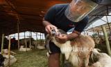 Warga memeriksa gigi kambing di sentra penjualan hewan kurban Cipocok, Serang, Banten, Kamis (23/7/2020). Menurut pedagang meski di tengah pandemi COVID-19, penjualan hewan kurban mengalami peningkatan dari biasanya 30 ekor menjadi 73 ekor dalam sehari dengan harga bervariasi. ANTARA FOTO/Asep Fathulrahman/aww. (FOTO : ANTARA/Asep Fathulrahman)