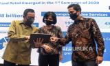 Direktur Utama Mandiri Sekuritas Dannif Danusaputro (kanan) berbincang dengan Direktur Retail Theodora VN Manik (tengah) dan Direktur Operations Mandiri Sekuritas Heru Handayanto (kiri) usai menyampaikan pencapaian kinerja Mandiri Sekuritas semester I 2020 di Jakarta, Kamis (23/7/2020). Pada semester I 2020, Mandiri Sekuritas mencatatkan pertumbuhan jumlah nasabah menjadi 145.000 atau naik 35 persen dari periode yang sama tahun sebelumnya. (FOTO : Antara/Nova Wahyudi)