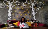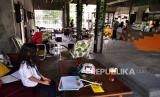 Siswi kelas 2 SD Sekolahku My School, Ziggy mengikuti kegiatan belajar mengajar daring di Kancane Resto and Tea Garden, Ngaglik, Sleman, Yogyakarta, Jumat (24/7). Layanan internet gratis untuk 15 siswa diberikan secara untuk belajar secara daring oleh Kancane Tea Garden. Dari jam 7.00 hingga 12.00 WIB siswa bisa memanfaatkan layanan gratis ini mulai Jumat (24/7) ini. (FOTO : Wihdan Hidayat / Republika)