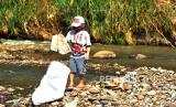 Seorang anak mengikuti aksi mulung sampah di sungai Ciliwung, Kelurahan Sukaresmi, Kota Bogor, Jawa Barat, Sabtu (25/7/2020). Kegiatan mulung sampah Ciliwung yang sempat terhenti selama empat bulan akibat terdampak pandemi COVID-19 tersebut kembali dilakukan dalam rangka memperingati Hari Sungai Nasional dengan tetap menerapkan protokol kesehatan. (FOTO : ANTARA/Arif Firmansyah)