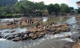 Sejumlah warga, relawan, komunitas, dan pemerintah daerah melakukan aksi mulung sampah di sungai Ciliwung, Kelurahan Sukaresmi, Kota Bogor, Jawa Barat, Sabtu (25/7/2020). Kegiatan mulung sampah Ciliwung yang sempat terhenti selama empat bulan akibat terdampak pandemi COVID-19 tersebut kembali dilakukan dalam rangka memperingati Hari Sungai Nasional dengan tetap menerapkan protokol kesehatan. (FOTO : ANTARA/Arif Firmansyah)