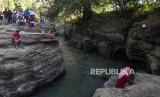 Sementara di Yogyakarta, wisatawan ramai mengunjungi objek wisata alam Batu Kapal di Piyungan, Bantul, Ahad (26/7/2020).