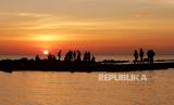 Pengunjung menikmati suasana matahari tenggelam (sunset) di Pantai Kuri Caddi, Maros, Sulawesi Selatan, Ahad (26/7/2020).  (FOTO : Antara/Arnas Padda )