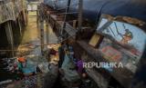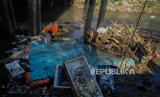 Petugas mengangkat sampah di aliran Sungai Ciliwung, Manggarai, Jakarta, Senin (27/7). Pada peringatan Hari Sungai Nasional yang diperingati setiap tanggal 27 Juli kondisi sungai Ciliwung masih dipenuhi sampah serta digunakan sebagai faslitias mandi, cuci kakus (MCK) yang berdampak pada pencemaran sungai akibat minimnya kesadaran masyarakat untuk menjaga lingkungan. (FOTO : Republika/Thoudy Badai)