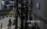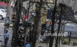 Deretan instalasi kabel yang semrawut di jalan Kyai Maja, Kebayoran Baru, Jakarta, Senin (27/7). Instalasi kabel yang saling tumpuk dan semrawut itu dapat menyebabkan kebakaran akibat konsleting listrik dan memperburuk estetika kota. Republika/Putra M. Akbar (FOTO : Republika/Putra M. Akbar)