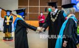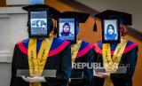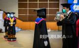 Rektor UNDIP Yos Johan Utama (kanan) menyerahkan ijazah kelulusan kepada robot peraga saat wisuda secara daring di Universitas Diponegoro (UNDIP), Semarang, Jawa Tengah, Senin (27/7/2020). WIsuda ke-159 UNDIP yang diikuti 2.561 lulusan itu menggunakan teknologi robot peraga yang menggantikan kehadiran fisik para wisudawan maupun wisudawati karena sejumlah kebijakan protokol kesehatan dalam upaya mencegah penyebaran COVID-19. (FOTO : Antara/Aji Styawan)