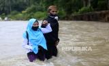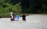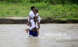 REPUBLIKA.CO.ID, GORONTALO -- Guru dan siswa Sekolah Dasar Negeri (SDN) 6 Tapa harus melintasi sungai Polanggua untuk menjalani pelajaran luar jaringan (luring) di Dusun III, Desa Langge, Tapa, Kabupaten Bone Bolango, Gorontalo, Rabu (29/7). Hal tersebut akibat ketiadaan jembatan menuju dusun III tersebut .