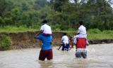 Dua orang guru Sekolah Dasar Negeri (SDN) 6 Tapa melintasi sungai Polanggua untuk mengajar pelajaran luar jaringan (luring) di Dusun III, Desa Langge, Tapa, Kabupaten Bone Bolango, Gorontalo, Rabu (29/7/2020). Guru dan siswa harus melintasi sungai untuk melakukan aktivitas belajar mengajar karena belum tersedianya jembatan menuju dusun III tersebut . ANTARA FOTO/Adiwinata Solihin/aww. (FOTO : ANTARAFOTO/Adiwinata Solihin)