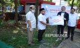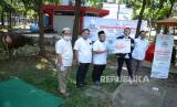 Area Manager West Java Region Huawei Mochammad Adi Prawiranegara (kedua kanan) menyerahkan mockup serah terima hewan kurban kepada Rektor Telkom University Prof Adiwijaya saat acara I Do Care Berbagi Qurban untuk Negeri, di halaman Masjid Syamsul Ulum Telkom University, Kecamatan Dayeuhkolot, Kabupaten Bandung, Rabu (29/7). Program Idul Adha 1441 H bersama Huawei dan Republika tersebut dilaksanakan di lima belas daerah di Indonesia. (FOTO : Edi Yusuf/Republika)