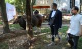 Area Manager West Java Region Huawei, Mochammad Adi Prawiranegara (kiri) bersama Ketua DKM Masjid Syamsul Ulum Telkom University, J Catur Prasetiawan meninjau hewan kurban saat penyerahan hewan kurban I Do Care Berbagi Qurban untuk Negeri, di halaman Masjid Syamsul Ulum Telkom University, Kecamatan Dayeuhkolot, Kabupaten Bandung, Rabu (29/7). Program Idul Adha 1441 H bersama Huawei dan Republika tersebut dilaksanakan di lima belas daerah di Indonesia. (FOTO : Edi Yusuf/Republika)