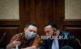 Terdakwa kasus dugaan korupsi pengelolaan keuangan dan dana investasi PT Asuransi Jiwasraya Joko Hartono (kiri) berbincang dengan penasihat hukumnya saat menjalani sidang lanjutan di Pengadilan Tipikor, Jakarta, Kamis (30/7/2020). Joko Hartono bersama Direktur Utama PT Hanson International Tbk Benny Tjokrosaputro dan Komisaris Utama PT Trada Alam Minera Tbk Heru Hidayat menjalani sidang lanjutan dengan agenda mendengarkan keterangan saksi yaitu trader saham Jimmy Sutopo, mantan sekretaris Heru Hidayat, Marine Imelda dan Cyndi Violeta. (FOTO : Antara/Aprillio Akbar)