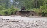 Sejumlah petugas pemerintahan daerah dan warga melintasi jalan Trans Papua terputus di Distrik Kuala Kencana, Kabupaten Mimika, Papua, Kamis (30/7/2020). Jalan Trans Papua yang menghubungkan Kabupaten Mimika Kabupaten Nabire terputus akibat banjir pada Minggu 26 Juli 2020 yang mengakibatkan sekitar 800 kepala keluarga terisolir dan sulit mengakses bahan kebutuhan pokok menuju Timika. (FOTO : Antara/Sevianto Pakiding)