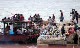 Warga menggunakan jasa transportasi kapal kayu yang telah difungsikan menjadi angkutan barang dan penumpang dari Banda Aceh tujuan Pulo (pulau) Aceh di pesisir pantai Selat Malaka, Banda Aceh, Aceh, Kamis (30/7/2020). Mayoritas warga yang mudik untuk merayakan hari raya Idul Adha 1441 H di pulau Aceh memilih angkutan kapal kayu sebagai sarana tranportasi penyeberangan meski pemerintah telah menyediakan kapal roro KMP Papuyu. A (FOTO : Antara/Irwansyah Putra)