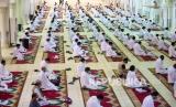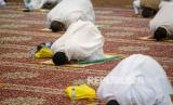 Jamaah haji melaksanakan shalat di dalam Masjid Namira di Arafah mengenakan masker dan menjaga jarak sosial untuk melindungi diri mereka terhadap virus corona di dekat kota suci Mekah, Arab Saudi, Kamis (30/7/2020). (FOTO : Saudi Ministry of Media via AP)