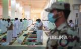 Jamaah haji membaca Alquran di dalam Masjid Namira di Arafah mengenakan masker dan menjaga jarak sosial untuk melindungi diri mereka terhadap virus corona di dekat kota suci Mekah, Arab Saudi, Kamis (30/7/2020). (FOTO : AP)