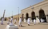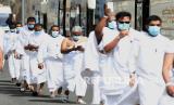 Jamaah haji memasuki Masjid Namira di Arafah mengenakan masker dan menjaga jarak sosial untuk melindungi diri mereka terhadap virus corona di dekat kota suci Mekah, Arab Saudi, Kamis (30/7/2020). (FOTO : AP)