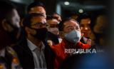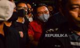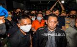 Ditangkap. Buronan BLBI yang juga terpidana kasus cessie Bank Bali Djoko Tjandra, digiring pihak kepolisian setibanya di Bandara Halim Perdanakusuma, Jakarta, Kamis (30/7). Djoko Tjandra ditangkap pihak kepolisian setelah menjadi buron sekitar 11 tahun usai berhasil kabur dari jerat hukum pada 2009 lalu. (FOTO : Republika/Thoudy Badai)