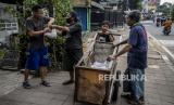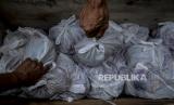 Petugas bersiap membagikan daging hewan kurban kepada warga di kawasan Tanah Abang, Jakarta, Jumat (31/7). DKM Masjid Jami Asy Syafiun membagikan 1.500 paket daging hewan kurban dengan cara mendatangi rumah warga untuk menghindari kerumunan di tengah pandemi COVID-19. Republika/Putra M. Akbar (FOTO : Republika/Putra M. Akbar)