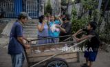 Seorang anak membagikan daging hewan kurban kepada warga di kawasan Tanah Abang, Jakarta, Jumat (31/7). DKM Masjid Jami Asy Syafiun membagikan 1.500 paket daging hewan kurban dengan cara mendatangi rumah warga untuk menghindari kerumunan di tengah pandemi COVID-19. Republika/Putra M. Akbar (FOTO : Republika/Putra M. Akbar)