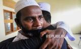 Pengungsi Rohingya saling berpelukan dan menangis usai melaksanakan shalat Idul adha 1441 H di Balai Latihan Kerja (BLK) Desa Mee Kandang, Lhokseumawe, Aceh, Jumat (31/7/2020). (FOTO : RAHMAD/ANTARA)