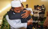 Pengungsi Rohingya saling berpelukan dan menangis, usai melaksanakan salat Idul adha 1441 hijriah sesuai jadwal yang ditetapkan pemerintah Indonesia, di Balai Latihan Kerja (BLK) Desa Mee Kandang, Lhokseumawe, Aceh, Jumat (31/7/2020). Sebanyak 99 orang pengungsi Rohingya Myanmar terdiri dari 43 orang dewasa dan 56 anak-anak merayakan Idul Adha 1441 hijriah sesuai dengan jadwal yang ditetapkan pemerintah Indonesia. (FOTO : RAHMAD/ANTARA)