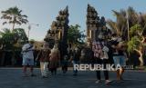Wisatawan domestik menggunakan masker saat liburan Idul Adha 1441H di masa Adaptasi Kebiasaan Baru tahap II di obyek wisata Tanah Lot, Tabanan, Bali, Sabtu (1/8/2020). Obyek wisata tersebut mulai dikunjungi wisatawan dari luar Pulau Bali dengan menerapkan protokol kesehatan COVID-19 meskipun jumlahnya masih sedikit. (FOTO : ANTARA/Nyoman Hendra Wibowo)