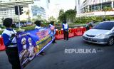 REPUBLIKA.CO.ID, JAKARTA -- Sejumlah anggota Kepolisian melakukan sosialisasi pemberlakuan kembali ganjil genap di Bundaran Hotel Indonesia, Jakarta, Ahad (2/8/2020). Dalam kegiatan sosialisasi itu para anggota kepolisian membentangkan spanduk informasi berisikan pemberlakuan kembali aturan ganjil genap. Mereka juga membagikan masker kepada para pengendara yang melintas. Pemprov DKI Jakarta menerapkan kembali aturan ganjil genap bagi kendaraan roda empat saat masa Pembatasan Sosial Berskala Besar (PSBB) transisi mulai Senin (3/8/2020) di 25 ruas jalan Ibu Kota.