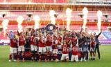 Pemain Arsenal merayakan kemenangan setelah berhasil menjuarai Piala FA 2019-2020 dengan mengalahkan Chelsea 2-1 pada pertandingan final di Wembley, Ahad (2/8) dini hari WIB. (FOTO : REUTERS/Adam Davy)