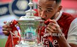 Pemain Arsenal Pierre-Emerick Aubameyang mencium trophy Piala FA saat merayakan kemenangan setelah berhasil menjuarai Piala FA 2019-2020 dengan mengalahkan Chelsea 2-1 pada pertandingan final di Wembley, Ahad (2/8) dini hari WIB. (FOTO : Adam Davy/NMC/Pool/PA POOL)