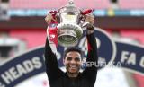 Pelatih Arsenal Mikel Arteta mengangkat trophy Piala FA saat merayakan kemenangan setelah berhasil menjuarai Piala FA 2019-2020 dengan mengalahkan Chelsea 2-1 pada pertandingan final di Wembley, Ahad (2/8) dini hari WIB. (FOTO : Catherine Ivill/Pool via AP)