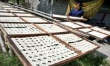 Pekerja menjemur rengginang di Adikarto, Muntilan, Magelang, Jawa Tengah, Senin (3/8). Rengginang termasuk makanan tradisional yang terbuat dari ketan. Di sini pembuatan rengginang mulai dari bahan baku hingga makanan jadi. Dan penjualan meliputi wilayah Jawa Tengah dan Yogyakarta. (FOTO : Wihdan Hidayat / Republika)