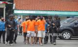 Petugas polisi menggiiring tersangka kasus narkotika saat rilis kasus pengungkapan jaringan narkotika lintas Sumatera-Jawa, di Polres Metro Jakarta Selatan, Jakarta, Senin (3/8/2020). Sat Reserse Narkoba Polres Metro Jakarta Selatan berhasil menangkap empat orang tersangka serta mengamankan barang bukti 131 Kg narkotika jenis sabu dan 160 Kg ganja dari hasil pengungkapan jaringan narkotika lintas Sumatera-Jawa. (FOTO : ANTARA /Reno Esnir)