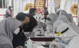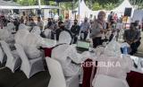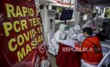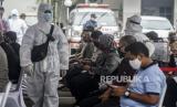 REPUBLIKA.CO.ID, JAKARTA -- Sejumlah karyawan KPU mengantre untuk mengikuti kegiatan tes swab dan tes diagnostik cepat Covid-19 secara massal di Kantor KPU, Jakarta, Selasa (4/8).