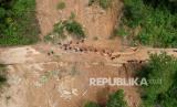 Foto aerial warga bergotong royong membersihkan material longsor di Desa Olele, Kabupaten Bone Bolango, Gorontalo, Selasa (4/8/2020). Desa tersebut terisolasi akibat material longsor yang menutup akses keluar masuk sejak 31 Juli lalu, sedangkan alat berat sulit dikerahkan akibat struktur tanah yang tidak stabil. (FOTO : Antara/Adiwinata Solihin)