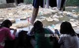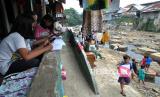 Siswa kelas 1 SMP Persatuan Umat Islam (PUI) Kota Bogor belajar kelompok secara daring di pinggir sungai Ciliwung, Kampung Kebon Jukut RT 01/10, Kelurahan Babakan Pasar, Kota Bogor, Jawa Barat, Selasa (4/8/2020). Belajar secara daring di pinggir sungai Ciliwung pada kampung padat penduduk tersebut dilakukan untuk mendapatkan jaringan internet yang baik dalam mengerjakan tugas-tugas sekolah di masa pandemi COVID-19.  (FOTO : ANTARA/ARIF FIRMANSYAH)