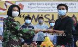Koordinator Yan Kes Letkol Ckm dr Paulin Marwita (kiri) memberikan potongan tumpeng kepada salah satu pasien sembuh dari COVID-19 saat Tasyakuran Tumpengan, di Rumah Sakit Lapangan Kogabwilhan II Jalan Indrapura, Surabaya, Jawa Timur, Selasa (4/8/2020). Pada hari ini Rumah Sakit Lapangan Kogabwilhan II telah berhasil menyembuhkan 64 orang pasien COVID-19 dan secara keseluruhan total sebanyak 1.022 orang pasien COVID-19 yang berhasil disembuhkan di rumah sakit tersebut. ANTARA FOTO/Didik Suhartono/hp. (FOTO : ANTARA/Didik Suhartono)