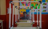 Pekerja memasang batas pelindung di meja siswa Sekolah Insan Sejahtera, Kampung Toga, Kabupaten Sumedang, Jawa Barat, Selasa (4/8/2020). Menyambut nol kasus COVID-19 di Kabupaten Sumedang, sejumlah sekolah mempersiapkan fasilitas yang mendukung protokol kesehatan untuk kembali menggelar pembelajaran tatap muka. ANTARA FOTO/Raisan Al Farisi/aww. (FOTO : RAISAN AL FARISI/ANTARA FOTO)