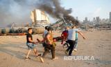Warga mengevakuasi korban dari lokasi ledakan di pelabuhan i Beirut, Lebanon, Selasa (4/8) waktu setempat. (FOTO : AP/Hassan Ammar)