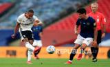 Fulham Bobby Decordova-Reid menendang bola pada final sepak bola Play Off Kejuaraan Inggris antara Fulham dan Brentford, di Stadion Wembley, London, Selasa (4/8/2020). (FOTO : Mike Egerton / PA via AP)