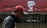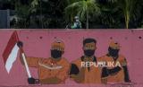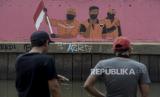 REPUBLIKA.CO.ID, JAKARTA -- Warga beraktivitas degan latar belakang mural bergambar Petugas Penanganan Prasarana dan Sarana Umum memegang bendera merah putih di kawasan Kampung Melayu, Jakarta, Kamis (6/8).