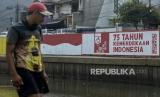 warga melintas di dekat mural di kawasan Kampung Melayu, Jakarta, Kamis (6/8). Mural yang dibuat oleh Petugas Penanganan Prasarana dan Sarana Umum (PPSU) itu dalam rangka menyambut Hari Kemerdekaan RI ke-75 yang jatuh pada Senin (17/8) mendatang. Republika/Putra M. Akbar (FOTO : Republika/Putra M. Akbar)