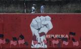 Warga melintas di dekat mural bergambar kepalan tangan dan kibaran bendera di kawasan Kampung Melayu, Jakarta, Kamis (6/8). Mural yang dibuat oleh Petugas Penanganan Prasarana dan Sarana Umum (PPSU) itu dalam rangka menyambut Hari Kemerdekaan RI ke-75 yang jatuh pada Senin (17/8) mendatang. Republika/Putra M. Akbar (FOTO : Republika/Putra M. Akbar)