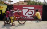 Warga saat beraktivitas dengan latar belakang tembok bergambarkan mural di kawasan Kampung Melayu, Jakarta, Kamis (6/8). Mural yang dibuat oleh Petugas Penanganan Prasarana dan Sarana Umum (PPSU) itu dalam rangka menyambut Hari Kemerdekaan RI ke-75 yang jatuh pada Senin (17/8) mendatang. Republika/Putra M. Akbar (FOTO : Republika/Putra M. Akbar)