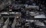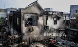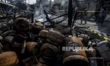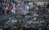 Warga melihat puing-puing sisa kebakaran di Pasar Timbul, Tomang, Jakarta, Jumat (7/8). Kebakaran yang disebabkan oleh korsleting listrik itu menyebabkan seluruh area pasar dan beberapa ruko sekitar hangus terbakar dan tidak ada korban jiwa dalam peristiwa tersebut. Republika/Putra M. Akbar (FOTO : Republika/Putra M. Akbar)