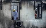 Petugas memakai baju hazmat melihat puing-puing sisa kebakaran di Pasar Timbul, Tomang, Jakarta, Jumat (7/8). Kebakaran yang disebabkan oleh korsleting listrik itu menyebabkan seluruh area pasar dan beberapa ruko sekitar hangus terbakar dan tidak ada korban jiwa dalam peristiwa tersebut. Republika/Putra M. Akbar (FOTO : Republika/Putra M. Akbar)